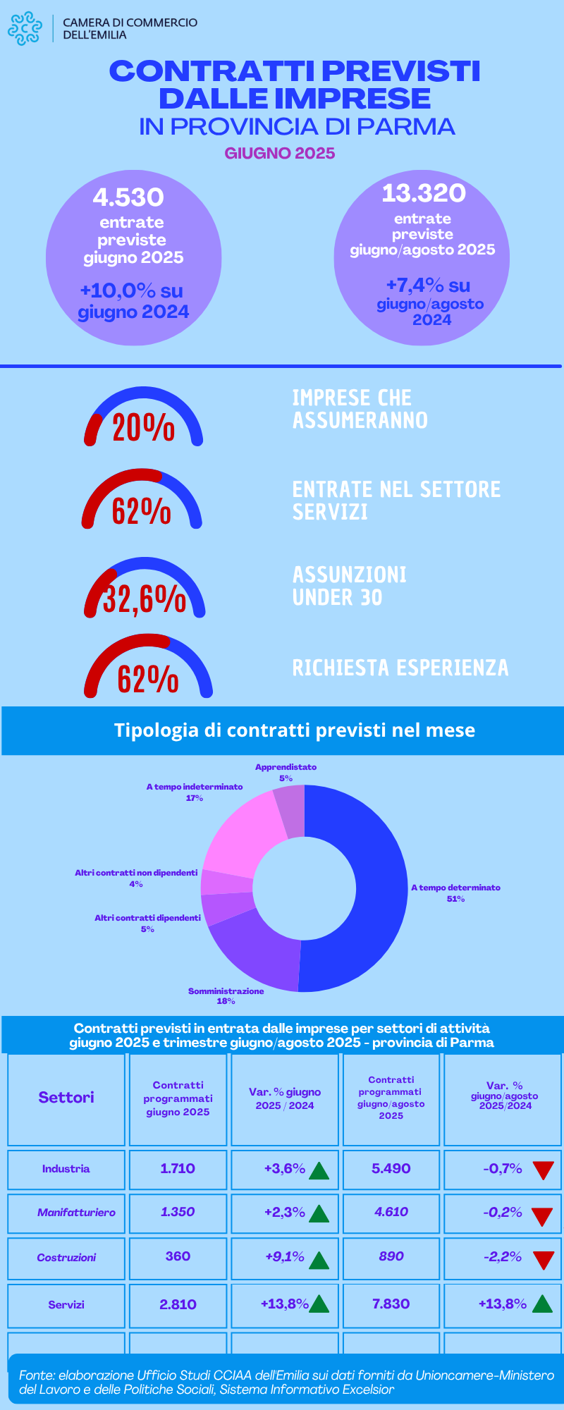 I nuovi contratti che le imprese della provincia di Parma prevedono di attivare nel mese di giugno risultano in crescita del 10,0% rispetto allo stesso mese del 2024, con un dato complessivo di 4.530 attivazioni (in aumento di ben 400 unità).