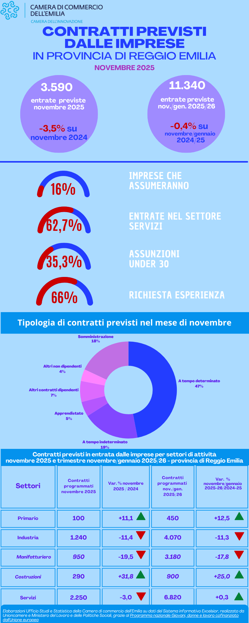 Sull’andamento dei nuovi contratti l’Ufficio Studi e Statistica della Camera di commercio dell’Emilia ha elaborato i dati forniti dal Sistema informativo Excelsior, realizzato da Unioncamere e Ministero del Lavoro e delle Politiche Sociali, grazie al Programma nazionale Giovani, donne e lavoro cofinanziato dall'Unione europea.