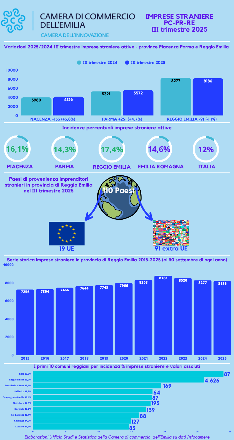 Per incidenza sul totale delle imprese attive nei diversi comuni, il primato spetta comunque a Rolo, dove le 87 imprese a guida straniera rappresentano il 29,0% del totale.