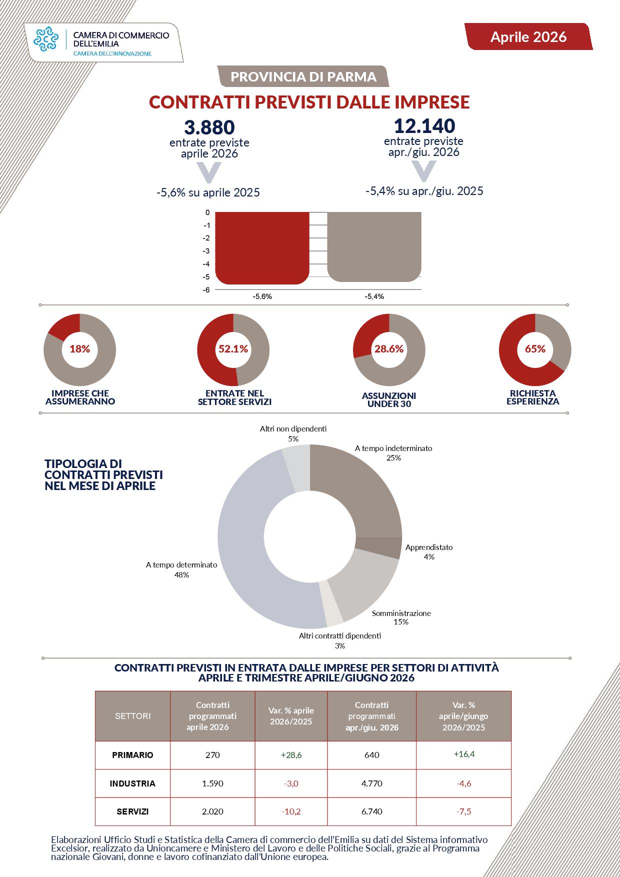 L’Ufficio Studi e Statistica della Camera di commercio dell’Emilia ha elaborato i dati forniti dal Sistema informativo Excelsior, realizzato da Unioncamere e Ministero del Lavoro e delle Politiche Sociali, grazie al Programma nazionale Giovani, donne e lavoro cofinanziato dall'Unione europea.