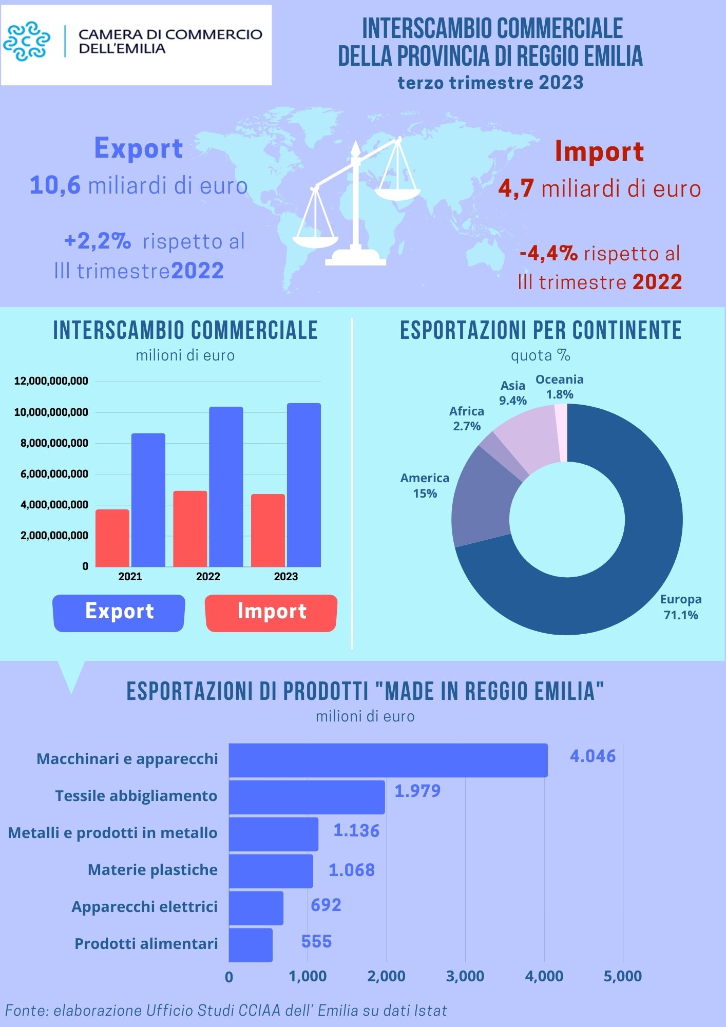 E’ salito a 10,6 miliardi di euro il valore delle esportazioni reggiane nei primi nove mesi del 2023, con una crescita del 2,2% rispetto allo stesso periodo del 2022.