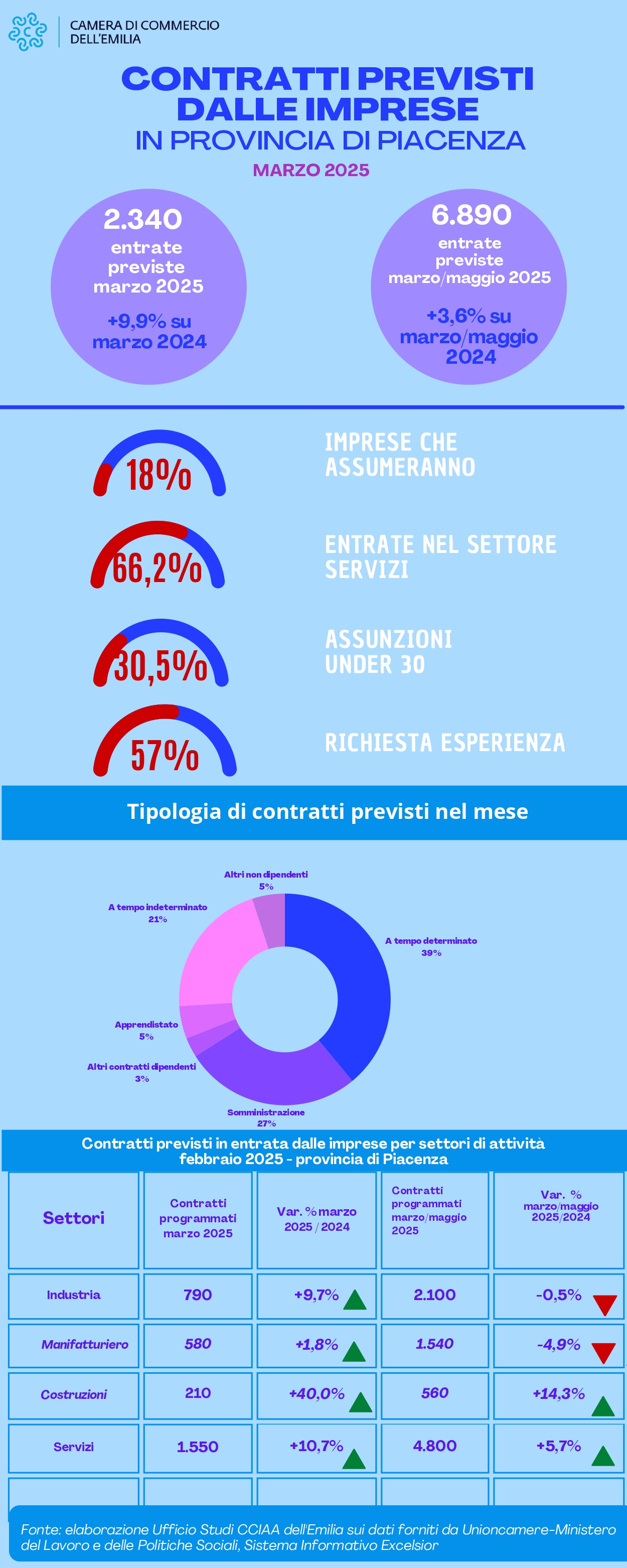 I nuovi contratti che le imprese della provincia di Piacenza intendono attivare nel mese di marzo risultano in aumento del 9,9% rispetto allo stesso mese del 2024, con un dato complessivo di 2.340 attivazioni. In crescita meno marcata i dati relativi al trimestre marzo-maggio, con previsioni di nuovi contratti pari a 6.890 unità rispetto ai 6.650 dello stesso trimestre 2024 (+3,6%).