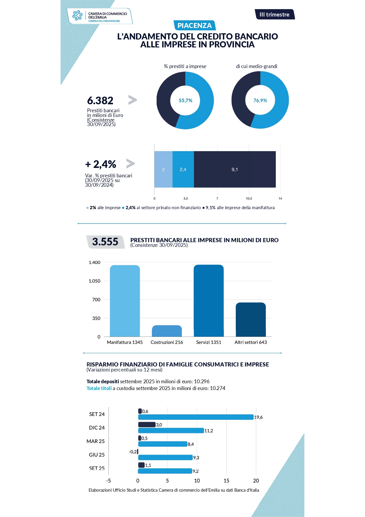 A fine settembre 2025, in provincia di Piacenza i prestiti erogati dal sistema del credito hanno registrato un aumento del 2,4% rispetto allo stesso periodo del 2024; gli impieghi bancari hanno così raggiunto i 6,3 miliardi di euro.