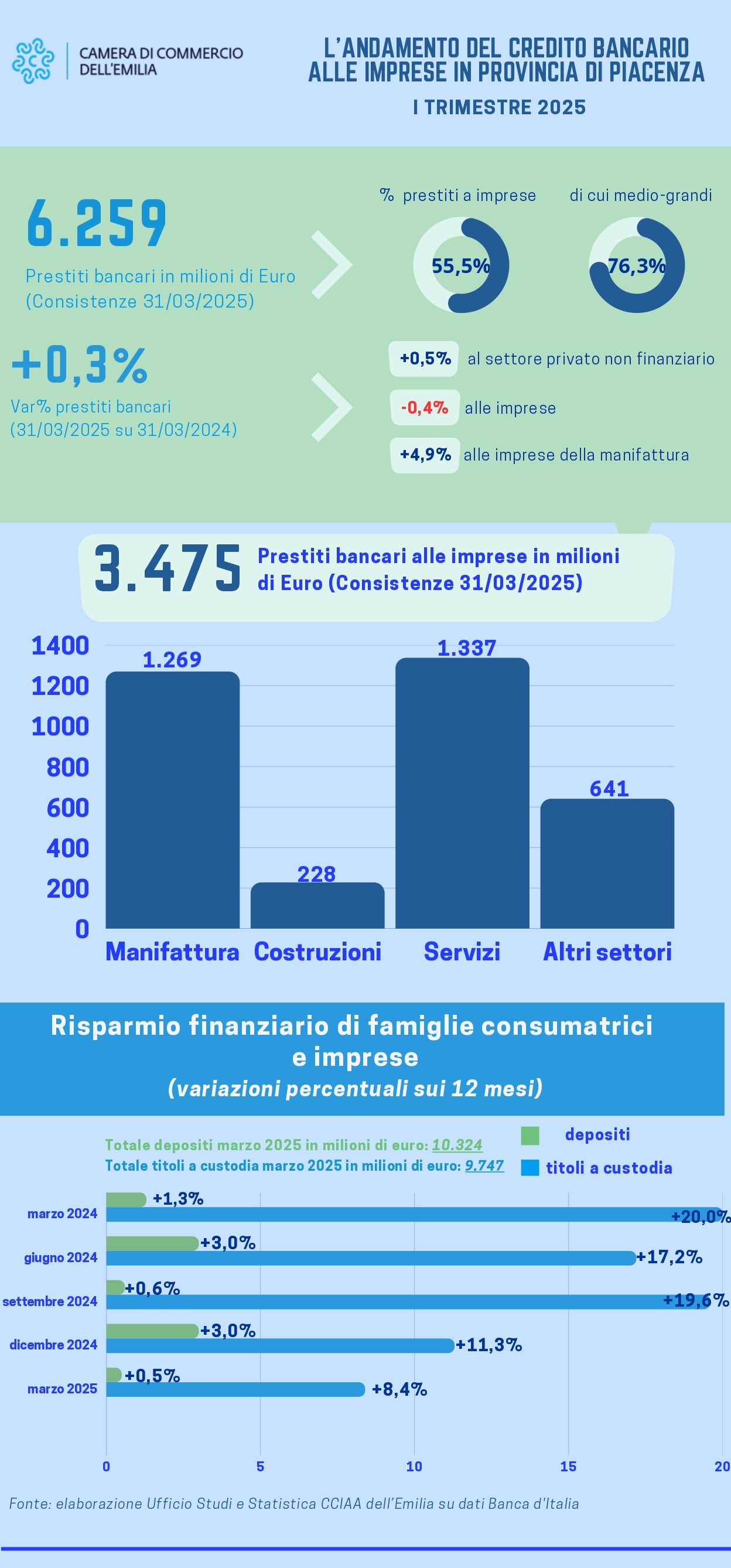 A fine marzo 2025 in provincia di Piacenza sono risultati in aumento dello 0,3% i prestiti erogati dal sistema di credito rispetto alla stessa data dello scorso anno, quando si era registrato un calo del 4,4%. Gli impieghi bancari sono così saliti a quasi 6,3 miliardi di euro.