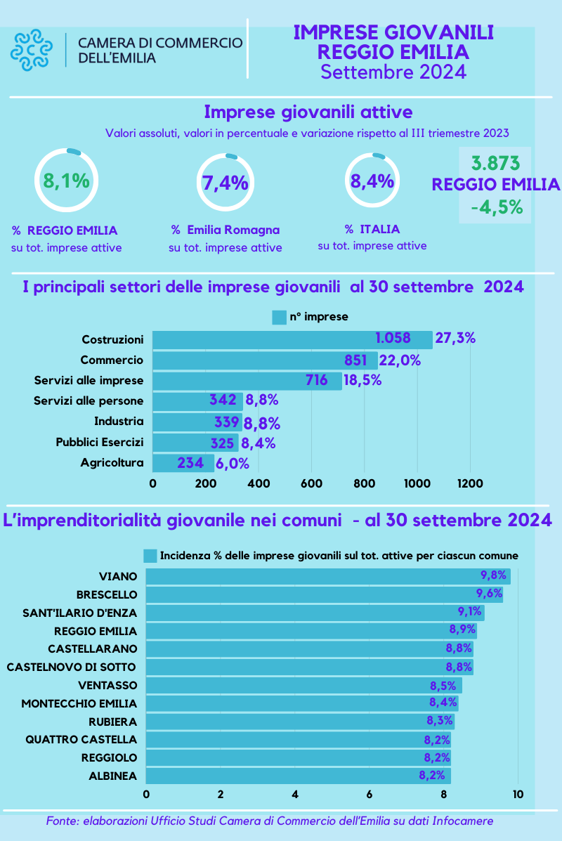 Sono 3.873 le imprese giovanili attive a Reggio Emilia; il dato, riferito al 30 settembre scorso, emerge dalle analisi dell’Ufficio studi della Camera di Commercio dell’Emilia, che evidenziano anche una tendenza alla flessione, con un -4,5% rispetto allo stesso periodo dello scorso anno.