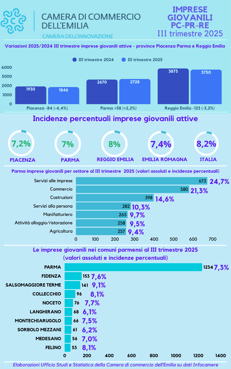 Così come per le altre tipologie d’impresa, a seguito delle modifiche intervenute nei mesi scorsi sulla classificazione delle attività economiche (codici Ateco 2025), attualmente è impossibile determinare quali siano stati, con esattezza, i movimenti all’interno dei diversi comparti produttivi e di servizio. Tuttavia, dalle analisi dell’Ufficio Studi e Statistica della Camera di commercio dell’Emilia su dati Infocamere, sono i servizi alle imprese a mostrare la maggiore presenza di imprese giovanili, con 673 unità attive e un’incidenza del 24,7% sul totale.