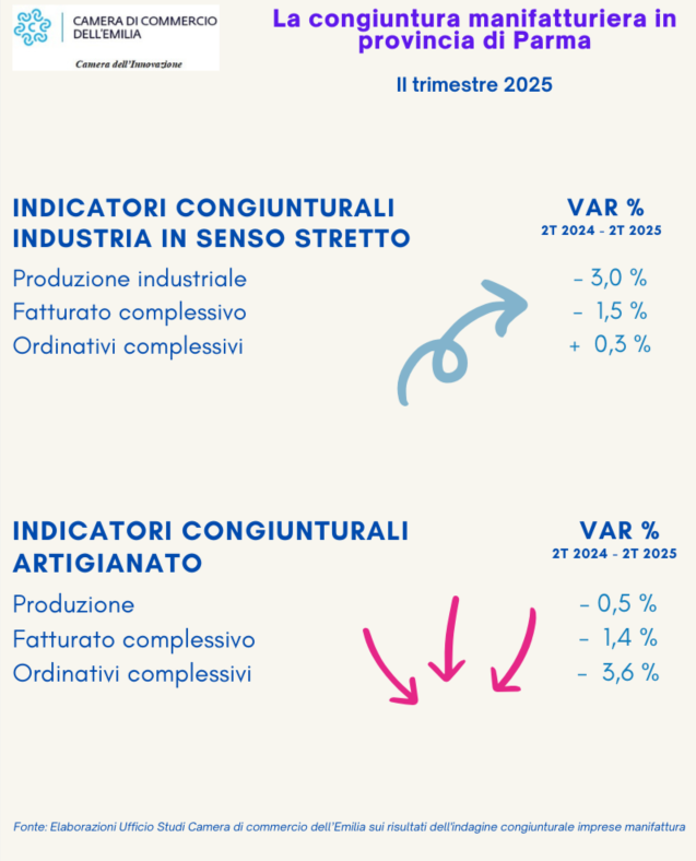 Si fanno più intensi i segnali di rallentamento per la manifattura parmense, che già aveva chiuso il primo trimestre 2025 con una lieve flessione della produzione (-0,2%) ma, comunque, si era salvata sul piano del fatturato, salito dell’1,1% rispetto allo stesso periodo del 2024.