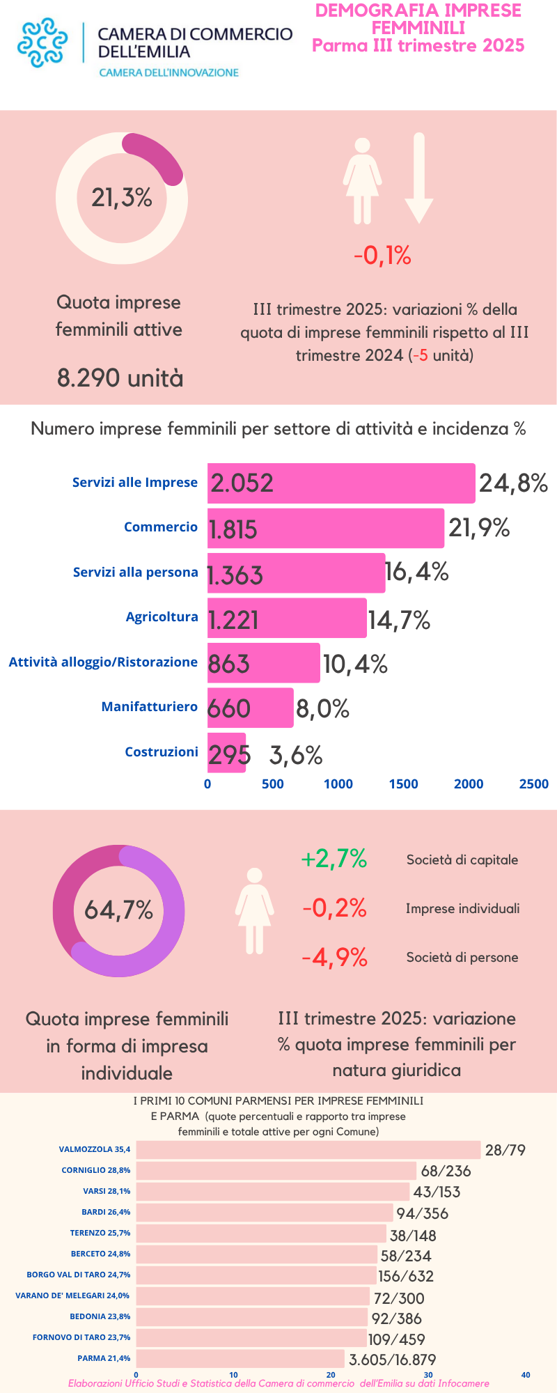 Le analisi relative alla distribuzione territoriale delle imprese femminili e alla loro incidenza sul totale delle aziende attive localmente collocano il comune capoluogo al primo posto in termini numerici (3.605 imprese femminili attive, che rappresentano il 21,4% sul totale delle unità produttive), mentre per l’incidenza sul totale delle imprese il primato va al comune di Valmozzola, con 28 aziende “in rosa” (il 35,4% sul totale delle attività presenti), seguito da Corniglio (68 imprese femminili e quota del 28,8% sul totale), Varsi (43 unità e incidenza al 28,1%) e Bardi (94 aziende femminili che rappresentano il 26,4% dell’insieme).