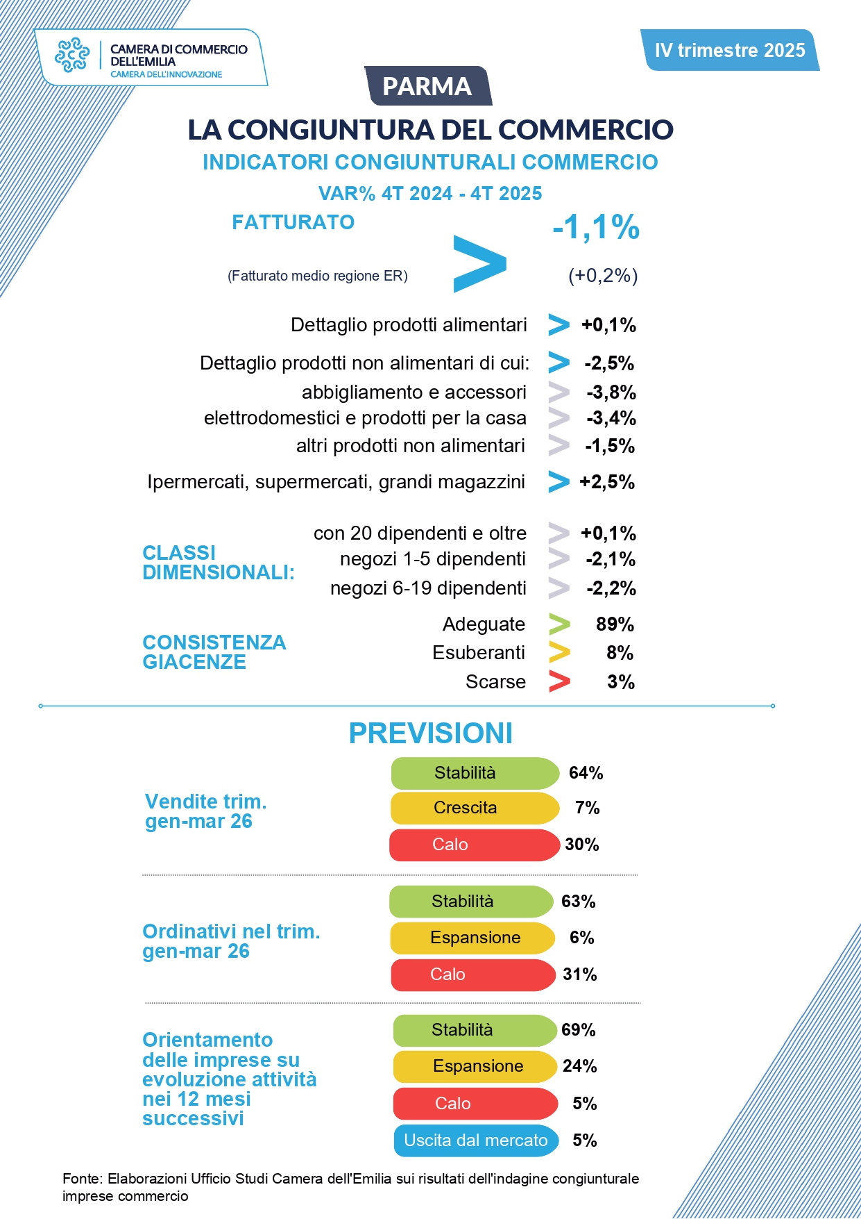 “E’ evidente – sottolinea il vicepresidente della Camera di commercio dell’Emilia, l’imprenditore parmense Vittorio Dall’Aglio – che per il commercio parmense vi sono difficoltà che si manifestano non solo con il moderato calo delle vendite avvenuto nel 2025, ma, ancor di più, nelle previsioni relative al futuro”.