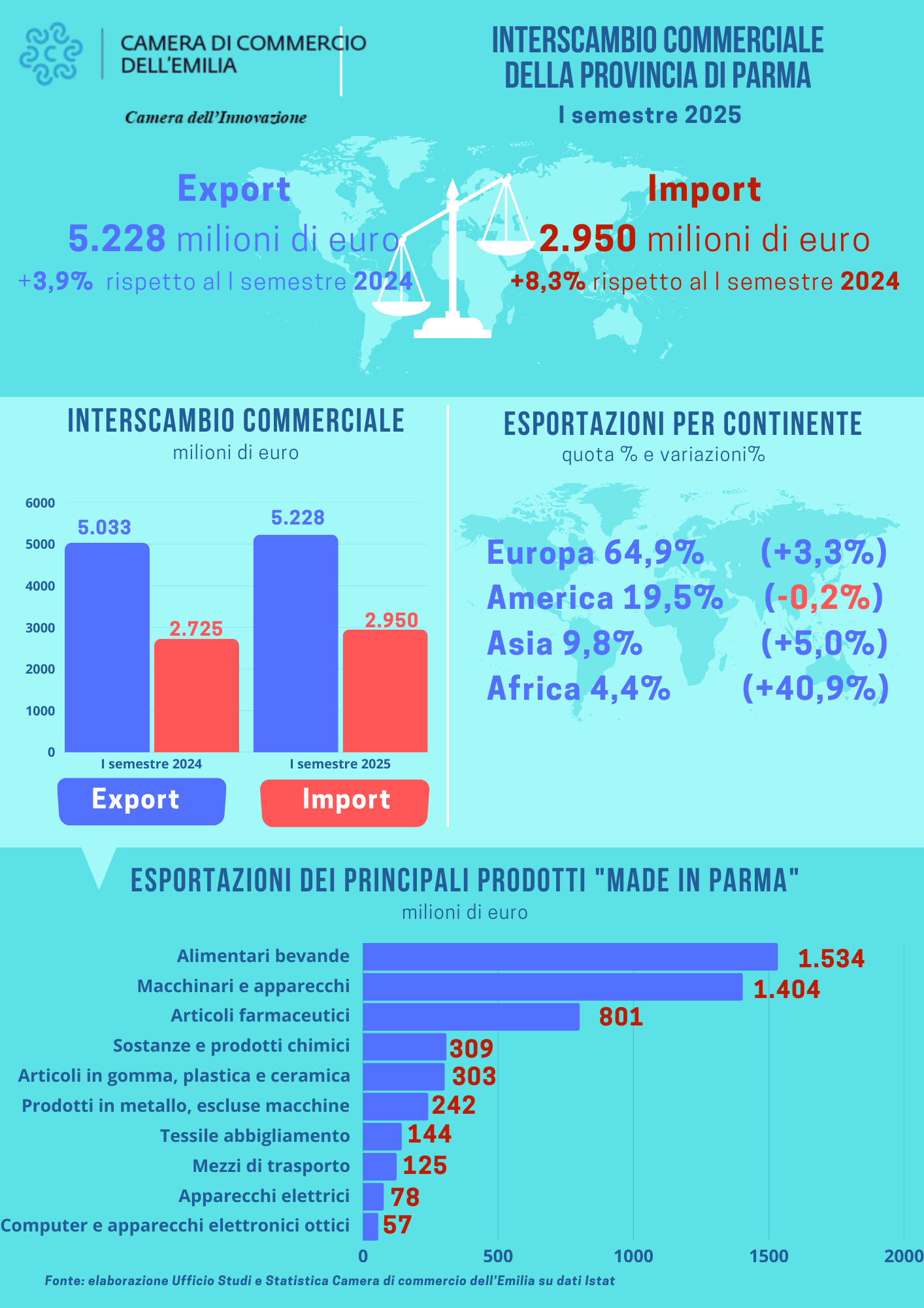 Dopo la lieve flessione registrata nel primo trimestre 2025 (-0,1%), le esportazioni parmensi hanno chiuso con un saldo positivo il primo semestre dell’anno.