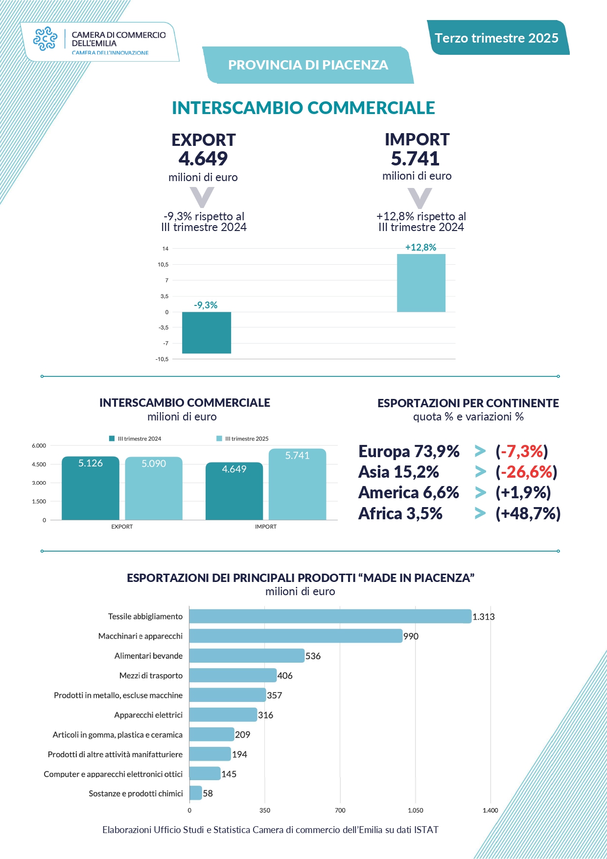Pur essendosi attenuata rispetto ai valori di fine giugno (-11,8%), resta ancora molto alta la flessione dell’export piacentino; al conclusione dei primi nove mesi dell’anno, infatti, si rileva un calo del 9,3%, che porta il valore dei flussi a 4,6 miliardi di euro, cioè 476 milioni in meno rispetto allo stesso periodo del 2024.