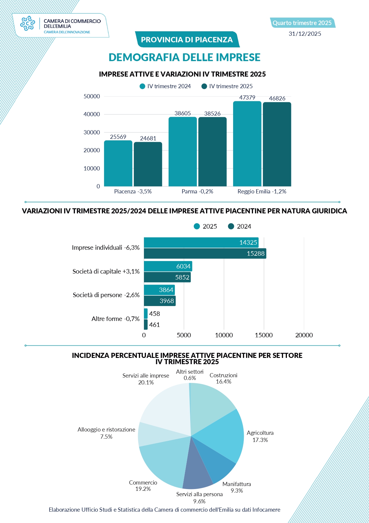 Le analisi della Camera di Commercio dell’Emilia hanno riguardato anche i movimenti all’interno delle diverse classi di natura giuridica delle imprese piacentine, ed è qui che si evidenzia, innanzitutto, il rafforzamento della presenza delle società di capitale (182 in più rispetto al 2024), salite a 6.034 (+3,1%.) Per converso, le ditte individuali, che incidono del 58,0% sul totale delle imprese attive piacentine, si sono attestate a 14.325 unità (-6,3%), con un contemporaneo arretramento anche per le società di persone (3.864, con un -2,6%) e una lieve flessione per le altre forme di impresa (prevalentemente cooperative e consorzi), che si sono attestate a 458 unità (-0,7%).