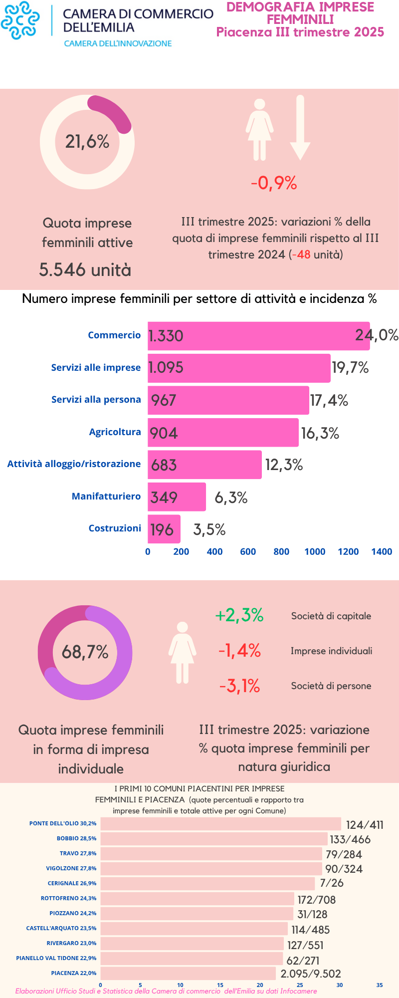 Le analisi relative alla distribuzione territoriale delle imprese femminili e alla loro incidenza sul totale delle aziende attive localmente collocano il comune capoluogo al primo posto in termini numerici (2.095 imprese femminili attive), mentre per l’incidenza sul totale delle imprese il primato va a Ponte dell’Olio, con 124 aziende guidate da donne (il 30,2% sulle imprese locali); seguono, in questa graduatoria, Bobbio (133 imprese femminili e 28,5% sul totale), Vigolzone (90) e Travo (79), entrambi con un’incidenza del 27,8%.