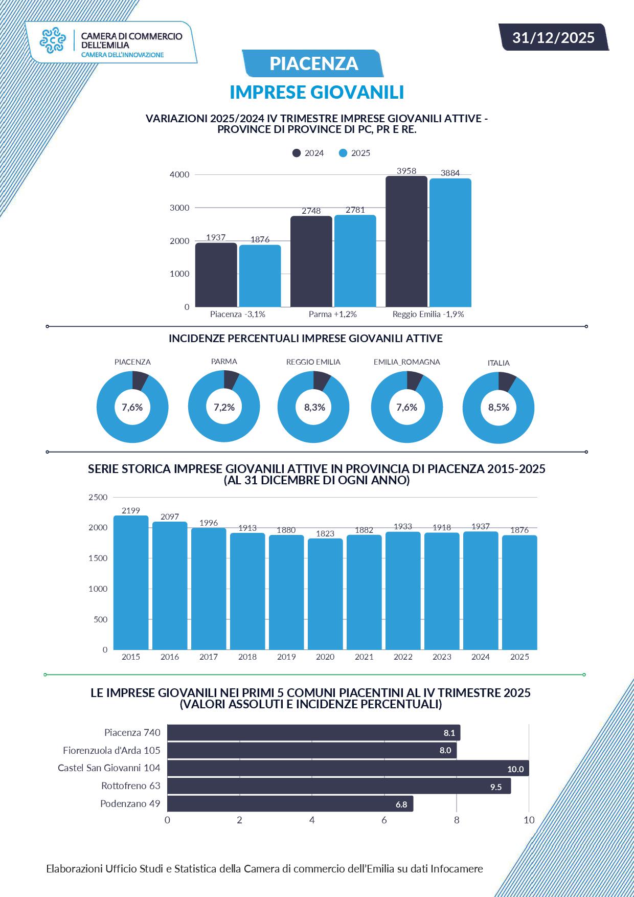 Con un calo di 61 unità in un anno (-3,1%), si sono attestate a 1.876 le imprese giovanili attive in provincia di Piacenza alla fine del 2025.