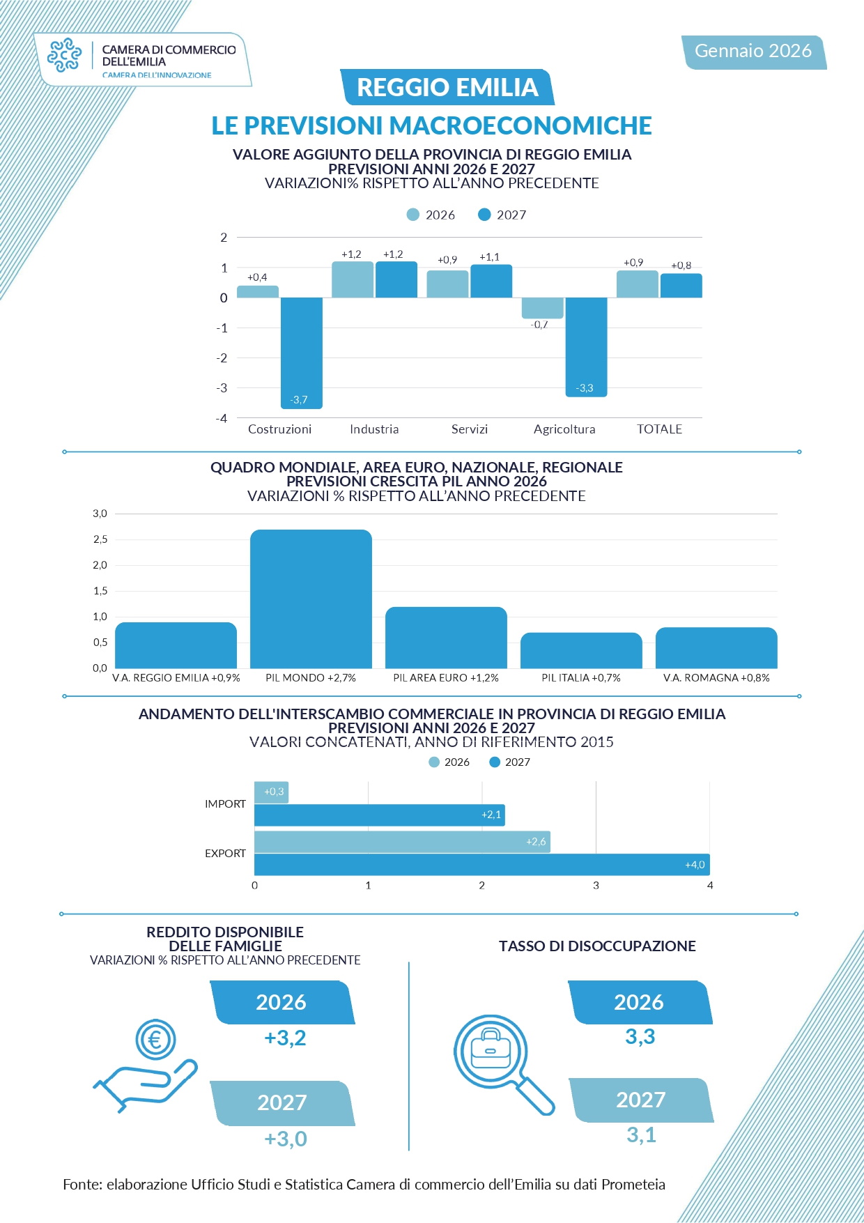 Con questo valore la nostra provincia si colloca, almeno in termini di previsioni, leggermente al di sopra rispetto di quelle che riguardano l’Emilia-Romagna e l’Italia (per le quali è previsto, rispettivamente, un +0,8 e un +0,7%), con una sostanziale replica nel 2027, anno in cui per l’economia reggiana è previsto un aumento del Pil dello 0,8%.