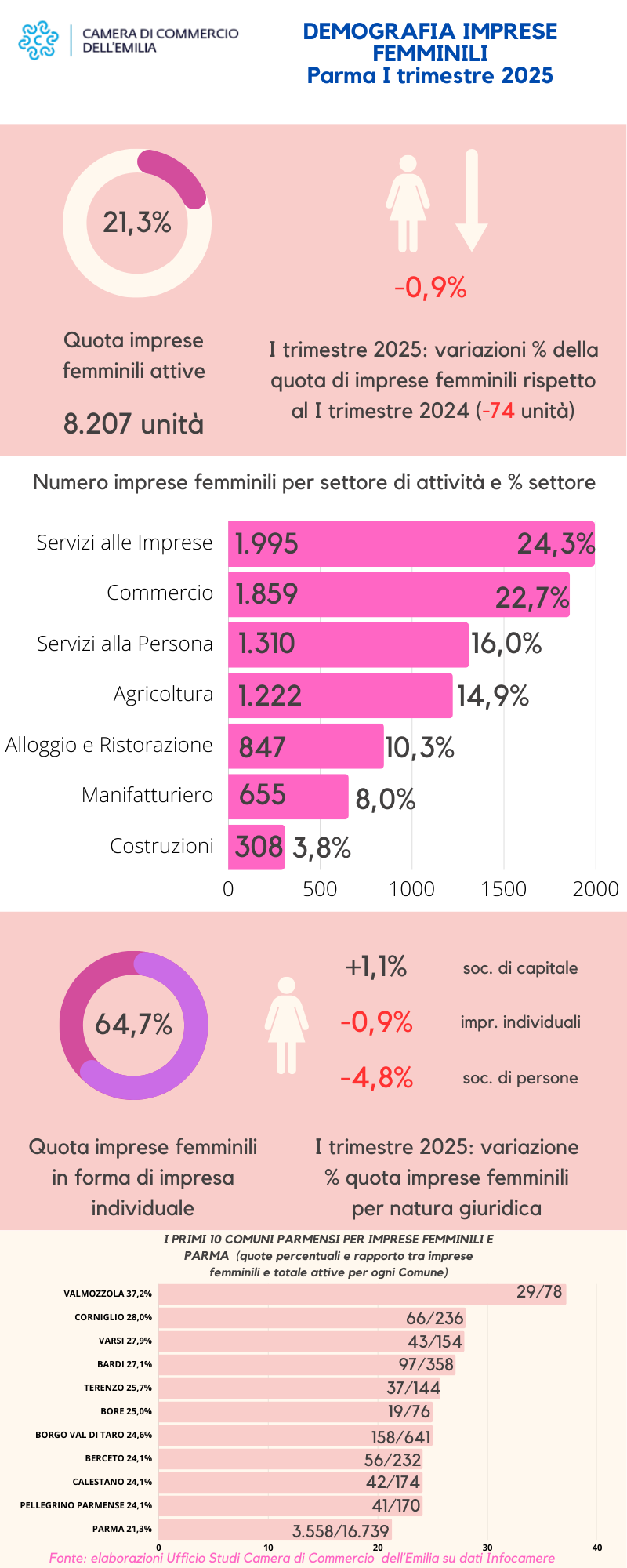 Sono scese di 74 unità, alla fine del primo trimestre 2025, le imprese femminili attive in provincia di Parma; un calo (-0,9% pressoché in linea con il -0,8% nazionale ed il -1,0% regionale) che ha portato le imprese “in rosa” parmensi ad 8.207, con un’incidenza del 21,3% sul totale delle imprese attive nel territorio.