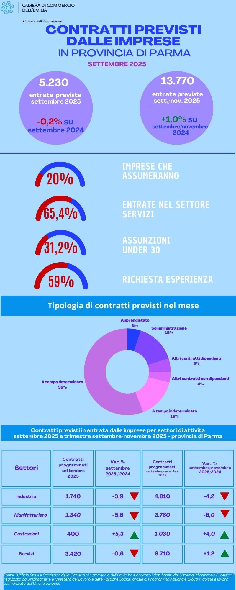 Così come era accaduto in agosto, con un -1,7% rispetto allo stesso mese del 2024, anche per il mese di settembre è previsto un calo dei nuovi contratti che le imprese parmensi intendono attivare.