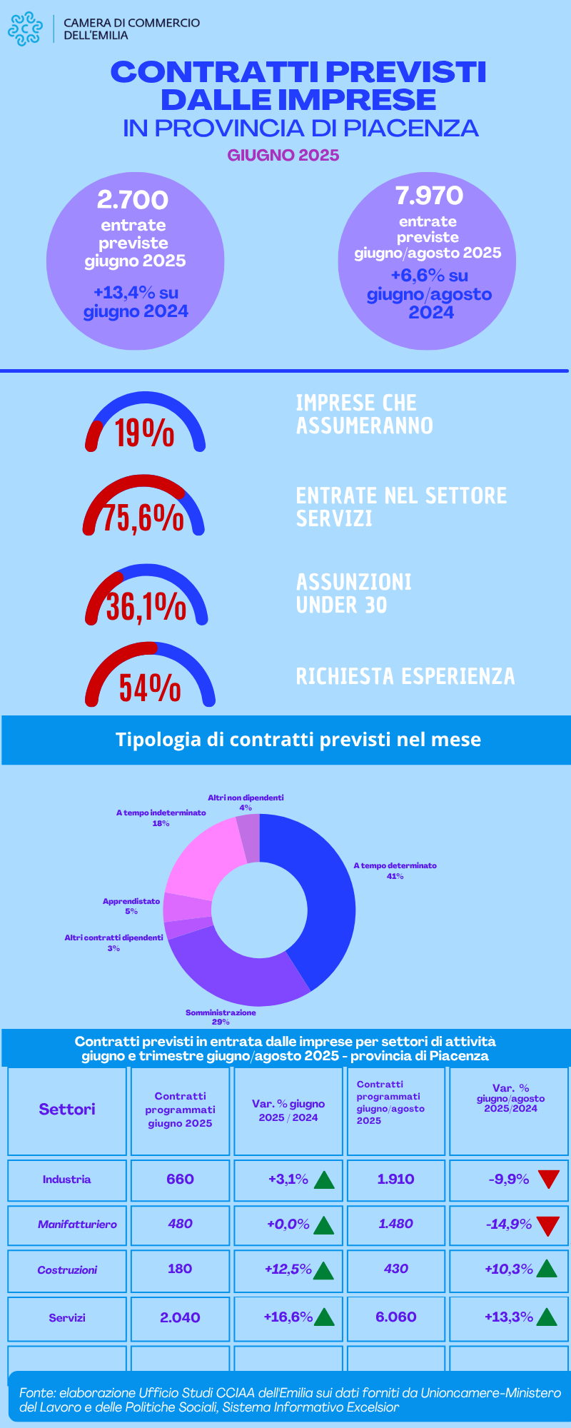 Dopo il -3,2% dello scorso maggio, i nuovi contratti che le imprese della provincia di Piacenza prevedono di attivare a giugno risultano in aumento del 13,4% rispetto allo stesso mese del 2024, con un dato complessivo di 2.700 attivazioni. In aumento, seppur percentualmente meno marcato, anche i dati relativi al trimestre giugno-agosto, con previsioni di nuovi contratti pari a 7.970 unità rispetto alle 7.480 dello stesso trimestre 2024 (+6,6%).