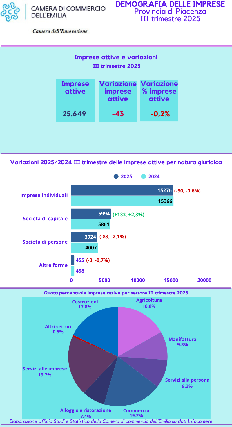 La lievissima flessione connota il piacentino come una delle realtà più resilienti sia a livello regionale che nazionale, dove il calo del numero delle imprese attive è stato, rispettivamente, dello 0,7% e dello 0,6%.