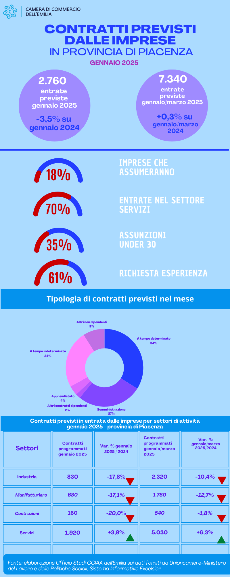 Dopo la “ripresina” del dicembre scorso (un +0,6% che non ha comunque modificato granché il bilancio di un anno chiuso con un calo del 2,5%), il numero dei nuovi contratti che le imprese della provincia di Piacenza intendono attivare nel mese di gennaio 2025 risulta nuovamente in flessione.