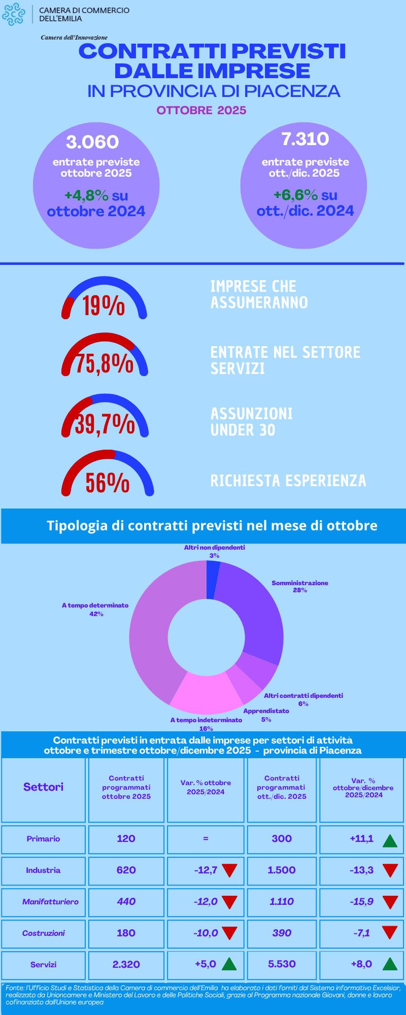 Il buon andamento dovrebbe poi proseguire per tutto il trimestre ottobre-dicembre, visto che le imprese piacentine contano di attivare 7.310 nuovi contratti, vale a dire 450 in più (+6,6%) rispetto allo stesso trimestre dello scorso anno.