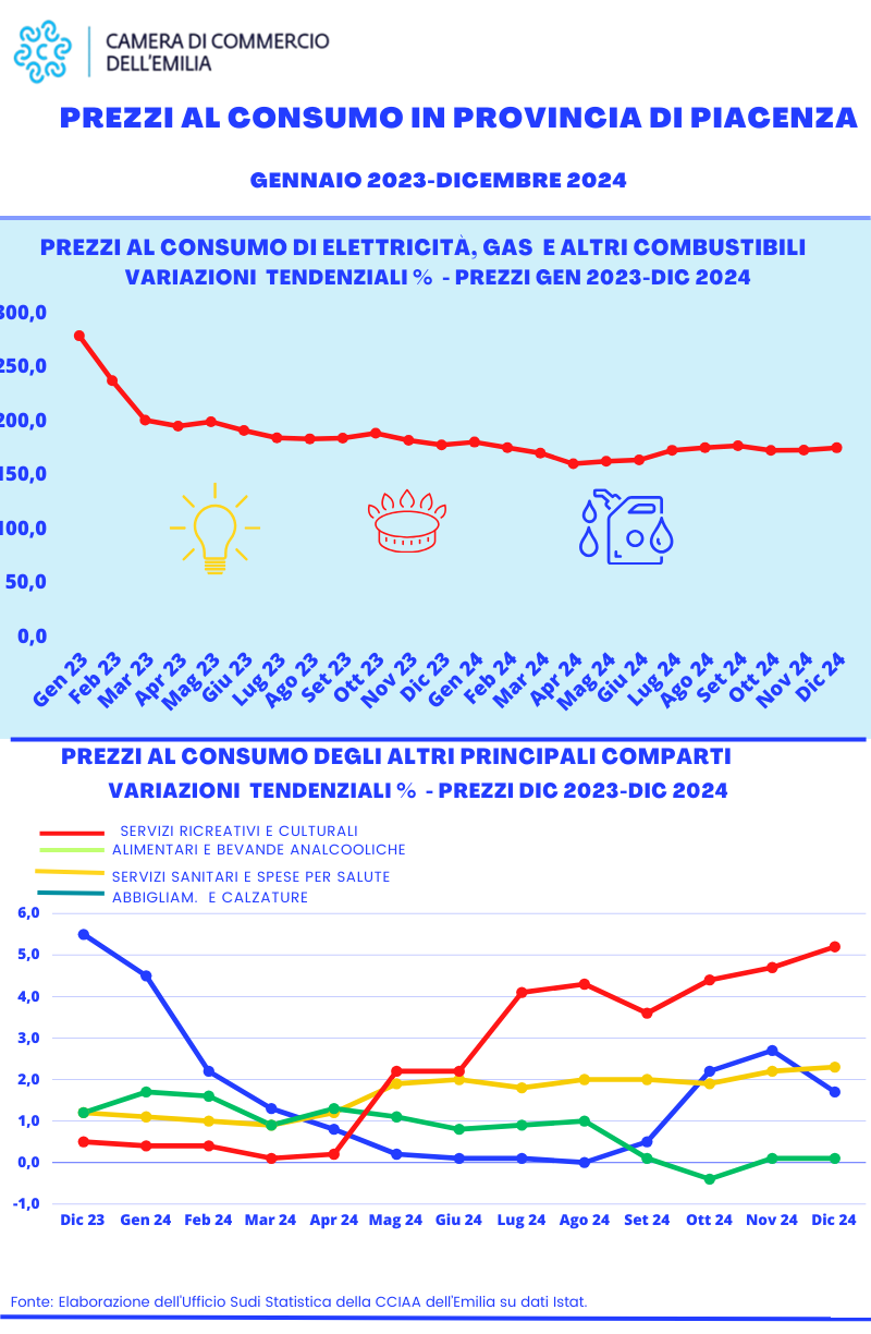 Nel 2024, secondo le elaborazioni della Camera di Commercio dell’Emilia su dati Istat, in provincia di Piacenza la variazione media dell’indice dei prezzi al consumo ISTAT per l’intera collettività (NIC) rispetto al 2023 è stata pari a +0,9%, con un evidente calo rispetto alla variazione media annua del 2023 (+5,3%) e un dato leggermente al di sotto di quello regionale e nazionale (entrambi a +1,0%).