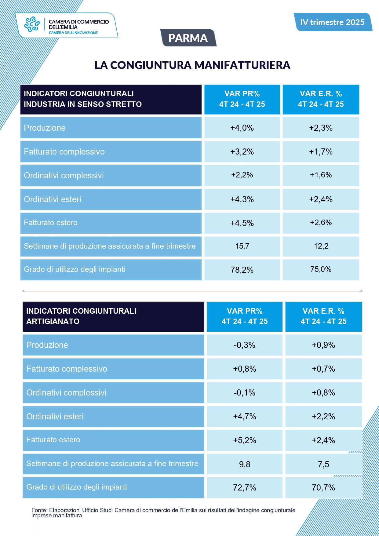 La manifattura parmense continua a mostrare segnali di miglioramento.