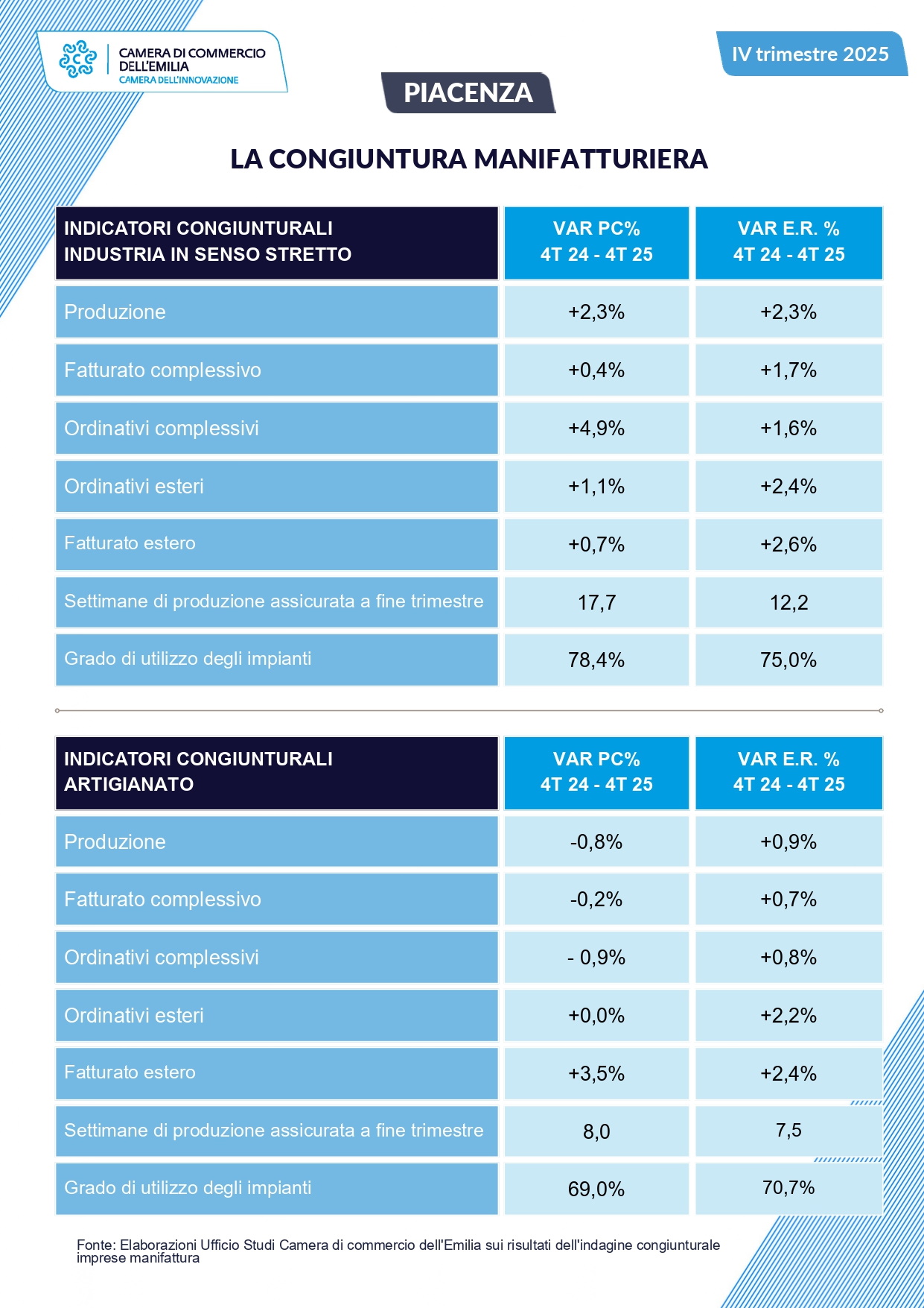 Dopo aver scontato un calo dello 0,5% alla fine del settembre scorso, nel quarto trimestre 2025 la produzione della manifattura piacentina è risultata in aumento del 2,3%, in linea con il dato regionale.