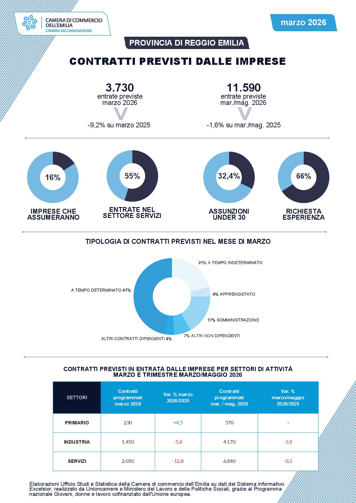 L’Ufficio Studi e Statistica della Camera di commercio dell’Emilia ha elaborato i dati forniti dal Sistema informativo Excelsior, realizzato da Unioncamere e Ministero del Lavoro e delle Politiche Sociali, grazie al Programma nazionale Giovani, donne e lavoro cofinanziato dall'Unione europea.