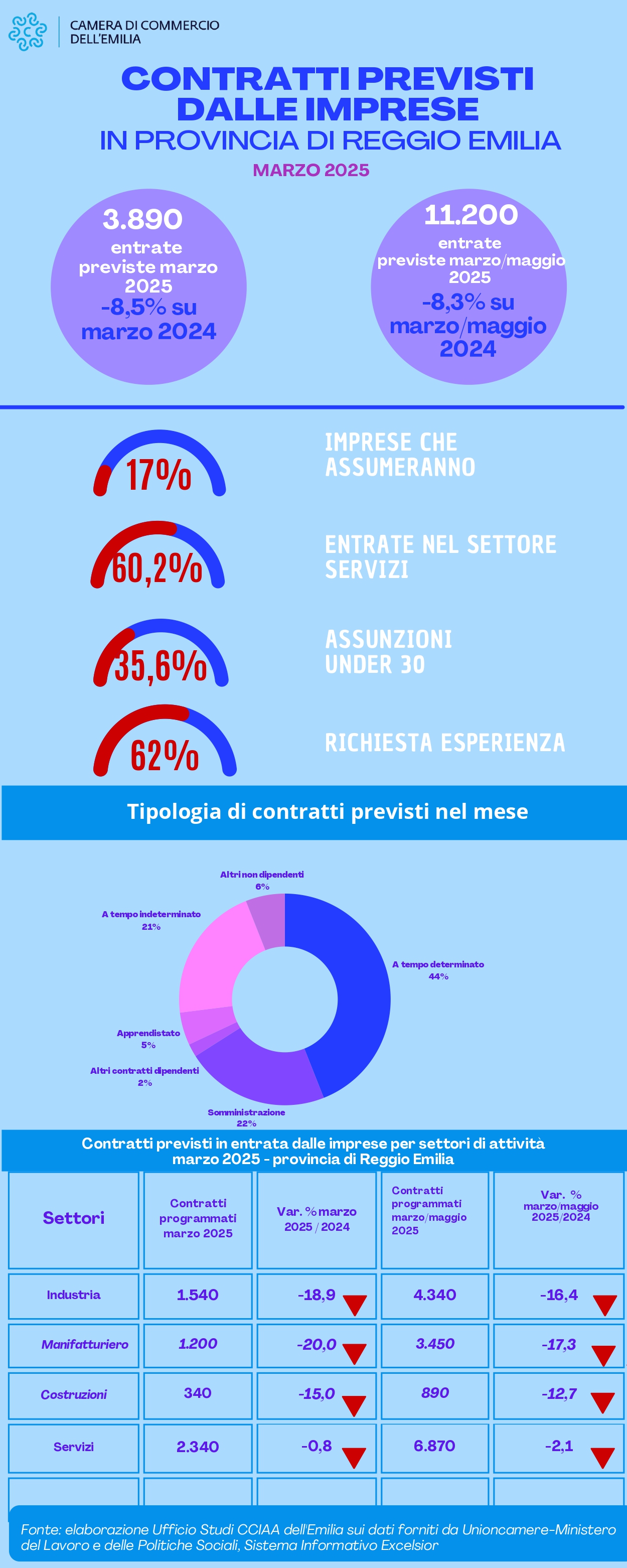 In quest’ambito, infatti, le imprese reggiane hanno programmato complessivamente l’attivazione di 1.540 nuovi contratti, vale a dire il 18,9% in meno rispetto a marzo 2024; all’interno del comparto, l’industria manifatturiera e le public utilities mostrano un calo del 20,0%, portando a 1.200 i nuovi contratti, mentre le costruzioni, con 340 nuove attivazioni, segnano un’ulteriore diminuzione del 15,0% rispetto allo stesso periodo dell’anno precedente.