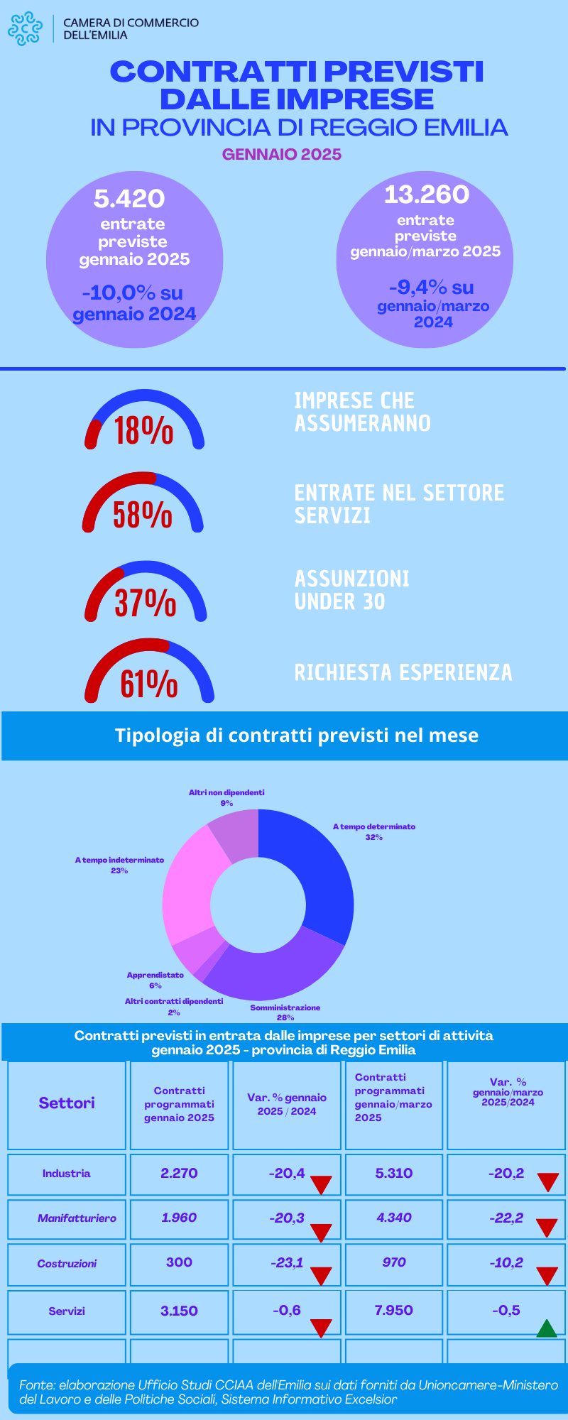 Archiviato il 2024 con un calo del 5,4% rispetto al 2023 e con un picco negativo del 12,1% a dicembre, i nuovi contratti che le imprese reggiane ipotizzano di attivare nel mese di gennaio 2025 mostrano ancora la tendenza alla diminuzione, con un totale di 5.420 nuove unità e una flessione del 10,0% rispetto allo stesso periodo dello scorso anno.