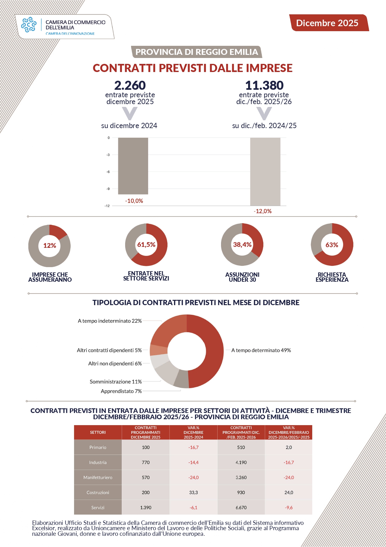 Sull’andamento dei nuovi contratti l’Ufficio Studi e Statistica della Camera di commercio dell’Emilia ha elaborato i dati forniti dal Sistema informativo Excelsior, realizzato da Unioncamere e Ministero del Lavoro e delle Politiche Sociali, grazie al Programma nazionale Giovani, donne e lavoro cofinanziato dall'Unione europea.