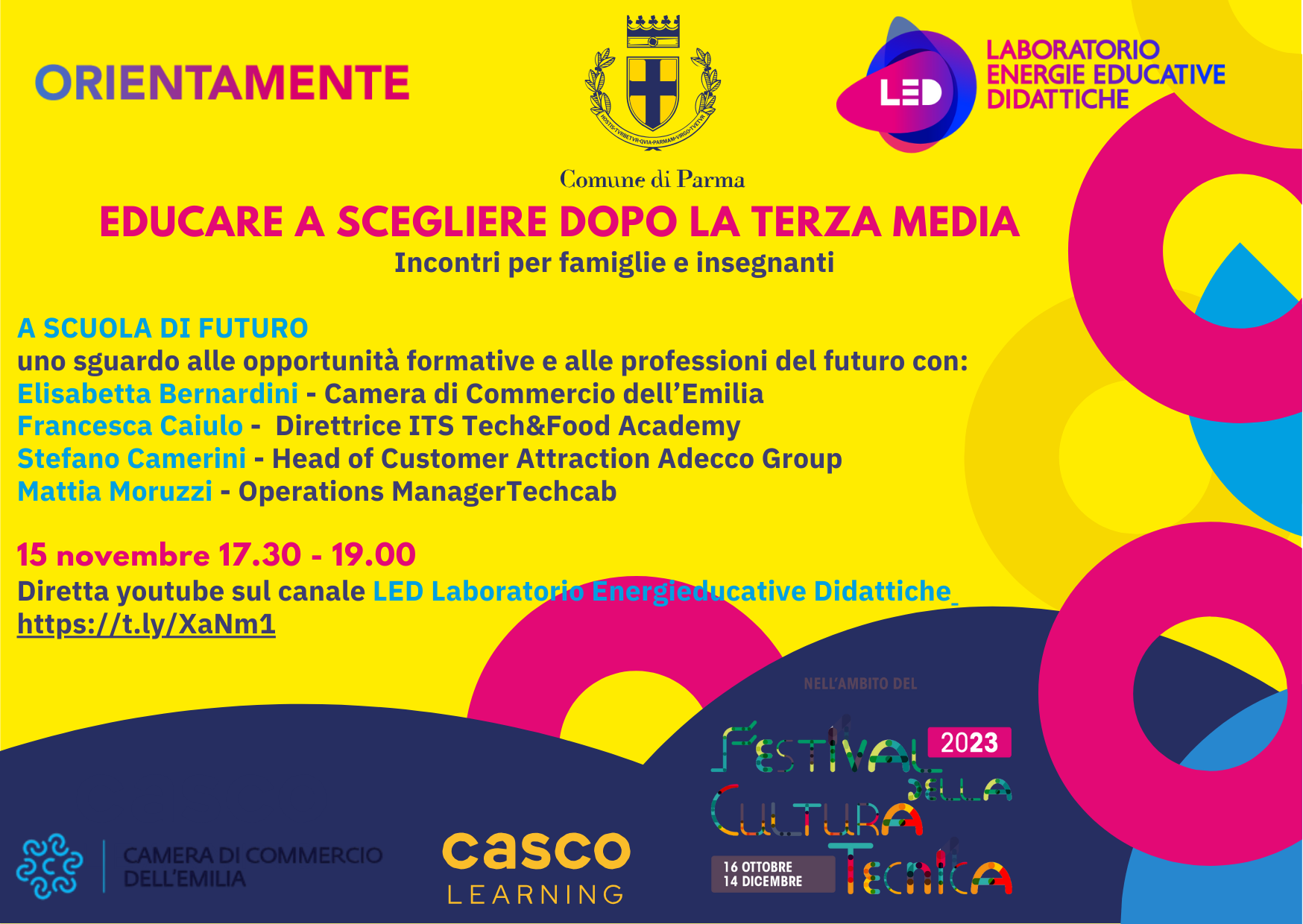 Il webinar rientra negli appuntamenti del Festival Della Cultura Tecnica di Parma ed è parte di ciclo di incontri online pensato per aiutare gli studenti e i loro genitori a orientarsi nella scelta della scuola, un passaggio ricco di aspettative, ma anche di dubbi e timori di sbagliare.